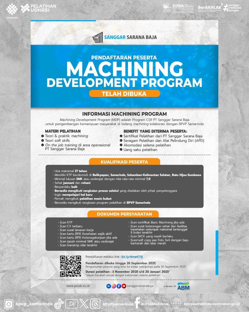 PT Sanggar Sarana Baja bekerja sama dengan BPVP Samarinda membuka Machining Development Program (MDP). Program ini diperuntukkan bagi lulusan SMK/sederajat ...