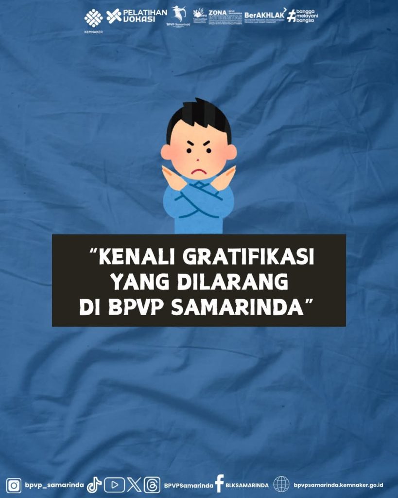 Balai Pelatihan Vokasi dan Produktivitas (BPVP) Samarinda berkomitmen memberikan pelayanan publik yang bebas dari pungutan liar (pungli) dan dijalankan secara ...