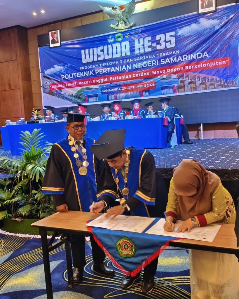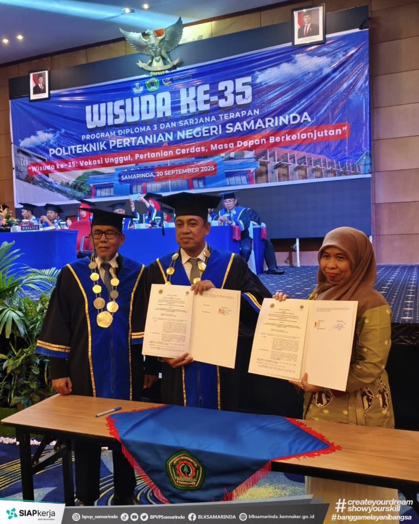 Sabtu, 20 September 2025, Balai Pelatihan Vokasi dan Produktivitas (BPVP) Samarinda menghadiri Undangan Wisuda ke-35 Politeknik Pertanian Negeri Samarinda dengan tema “Vokasi Unggul, Pertanian Cerdas, Masa Depan Berkelanjutan.”