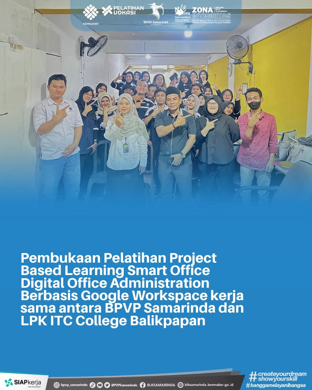Rabu, 5 November 2025, telah dilaksanakan kegiatan pembukaan pelatihan Project Based Learning (PBL) sektor Smart Office Digital Office Administration berbasis Google Workspace dengan total durasi 200 jam pelatihan. Kegiatan ini merupakan hasil kerja sama antara BPVP Samarinda dan LPK ITC College Balikpapan.