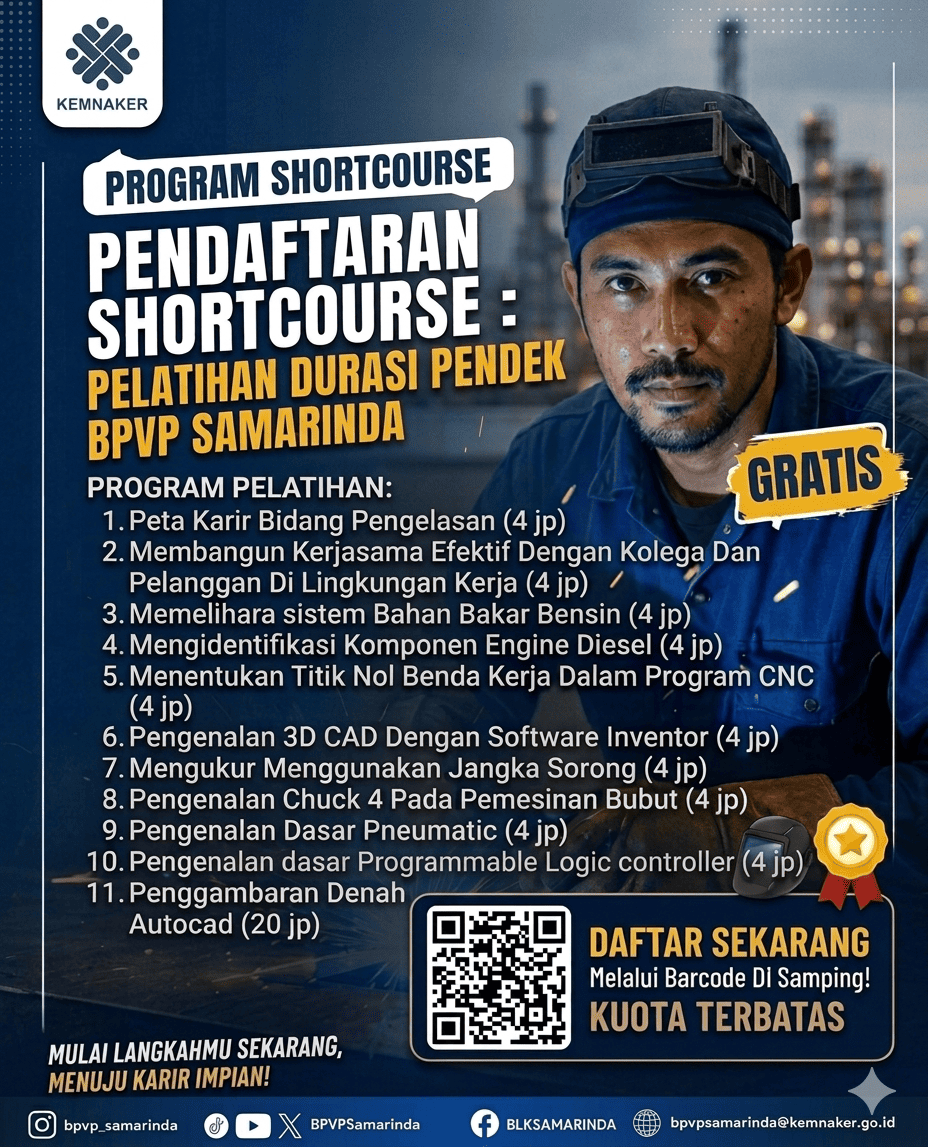 PENDAFTARAN SHORTCOURSE : PELATIHAN BERDURASI PENDEK BPVP SAMARINDAOlehPemberdayaan BPVP Samarinda April 24, 2026Share:←Penguatan Kemitraan Institusional dalam Mendukung Program Peningkatan Keterampilan Warga Binaan