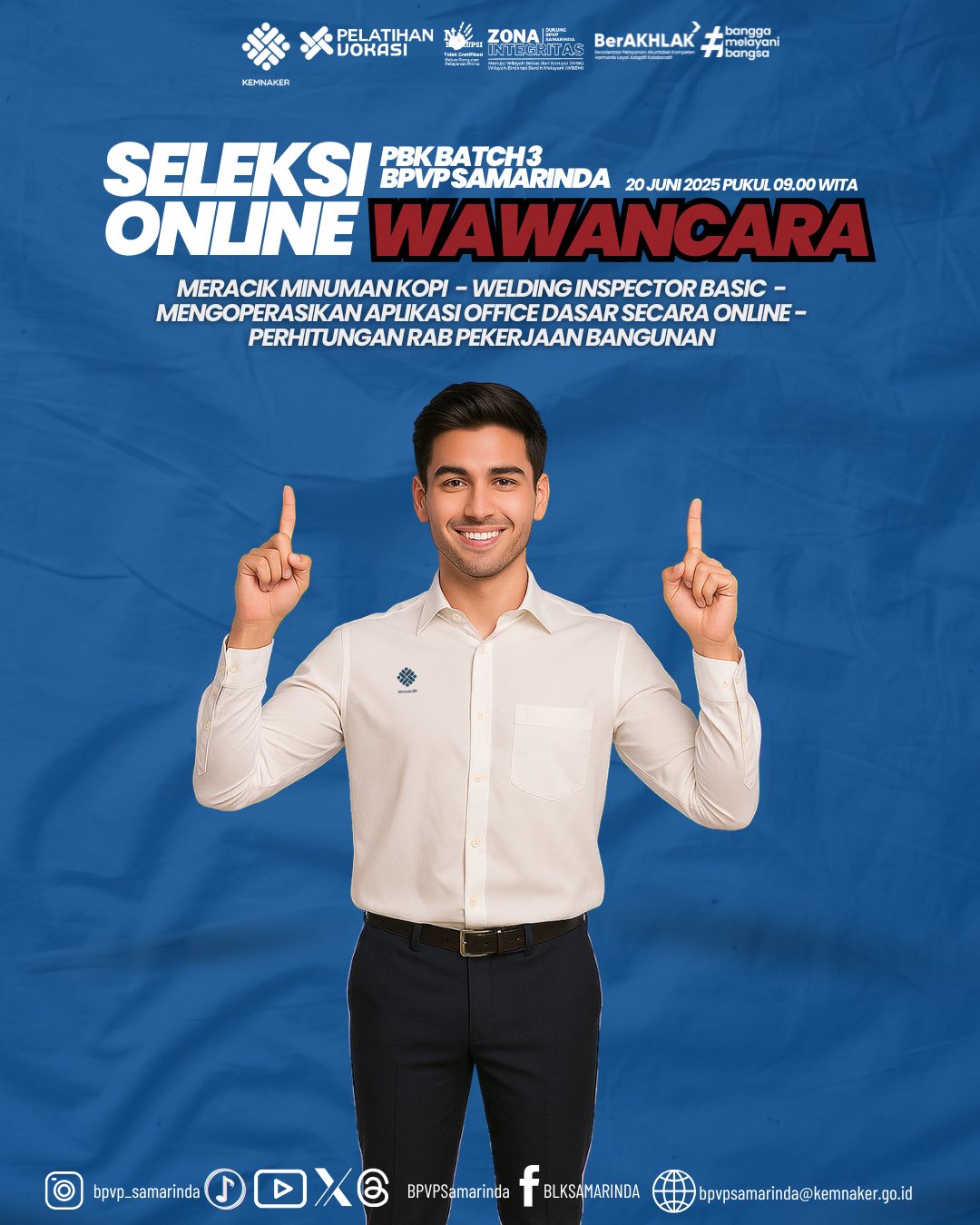 Mohon aktif memantau media sosial BPVP Samarinda. Informasi terkait pelaksanaan seleksi hanya akan diumumkan melalui Facebook dan Instagram resmi BPVP Samarinda. Panitia tidak akan menghubungi peserta secara pribadi.